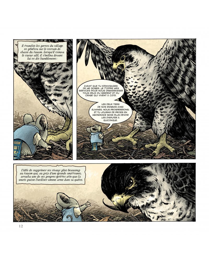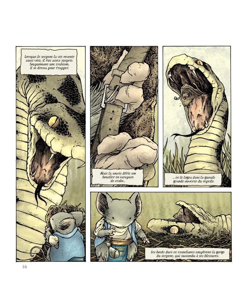 Les rongeurs héros de Légendes de la garde sont à rapprocher de ces dessins animés pour adultes que sont Fievel ou Brisby et le Secret de Nimh pour leur intelligence dans le scénario et la justesse de l’écriture. Dans cet univers dont le décor semble tout droit sortir de Thorgal, David Petersen crée un monde complexe et fascinant en alternant les lieux et les époques dans la plus pure tradition du Seigneur des anneaux. Avec ces recueils classés par saisons et les hors-série qui proposent des contes antérieurs à l’intrigue principale, le dessinateur crée un monde cohérent avec ses propres codes et ses propres légendes en marge de l’intrigue principale. Très crédible, cette genèse lui permet de proposer autant de mini-récits que de personnages et nous propose d’explorer ce monde enchanteur.