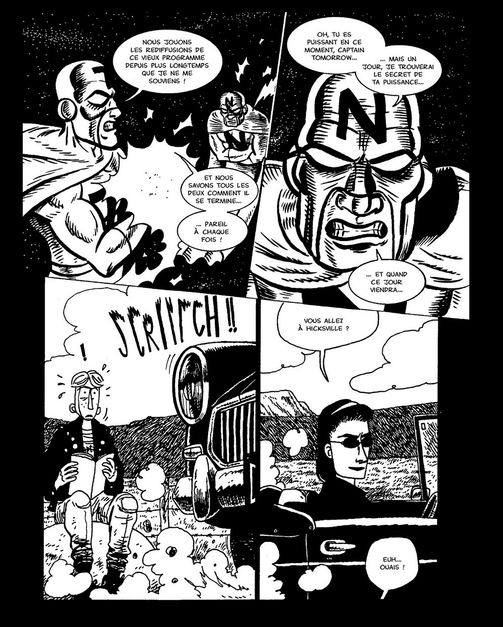Mais revenons à nos beaux souvenirs. Dylan Horrocks nous entraîne à Hicksville, cette petite ville de la Nouvelle-Zélande où tout le monde lit des comics, où se trouvent les éditions les plus rares de précieux magazines et surtout d’où vient Dick Burger l’auteur le plus célèbre du moment, véritable successeur de Jack Kirby au titre de roi des comics. En suivant le journaliste Leonard Batts sur les traces de cet auteur milliardaire, nous découvrons aussi les comics dessinés par les habitants d’Hicksville jusqu’aux célèbres planches du roman graphique de Burger qui ont bouleversé l’industrie du comics américain et qui cachent le plus grand secret des comics…