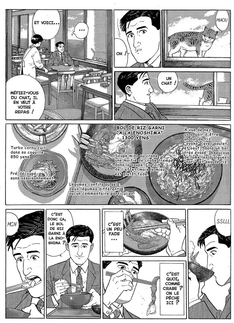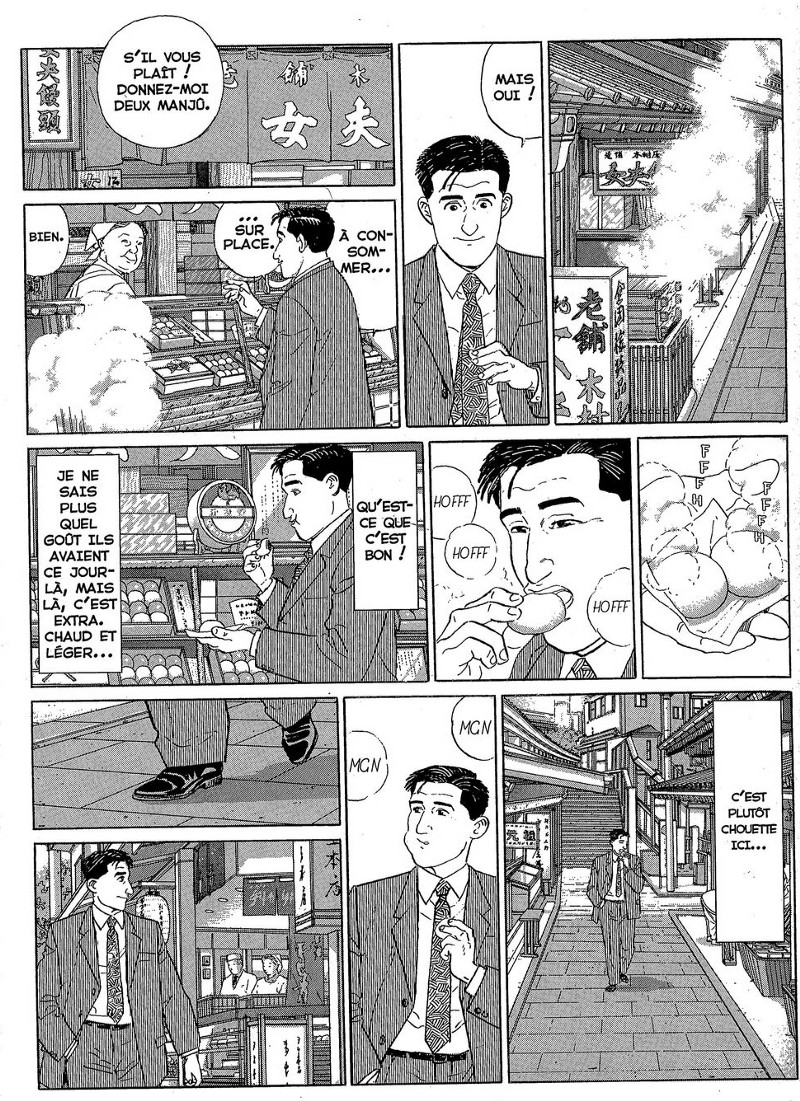 Une grande partie des histoires de Jirō Taniguchi évoquent une quête intérieure, une envie de comprendre le monde ou de devenir meilleur. Et ce manga est l’une des rares exceptions à la règle. Les auteurs se permettent de s’attarder sur la saveur de l’instant présent ; un plaisir rare dans notre société hyper connectée qui prône la rapidité et l’efficacité. Laissons le hasard guider parfois nos pas, un principe fondamental dans les histoires du Maître — prendre son temps. Apprécions chaque moment pour ce qu’il est, avec ses propres qualités et ses défauts, à l’image des plats dégustés par notre héros. Je vous laisse, pour aller me promener et pourquoi pas manger un morceau en trinquant à Jirō.