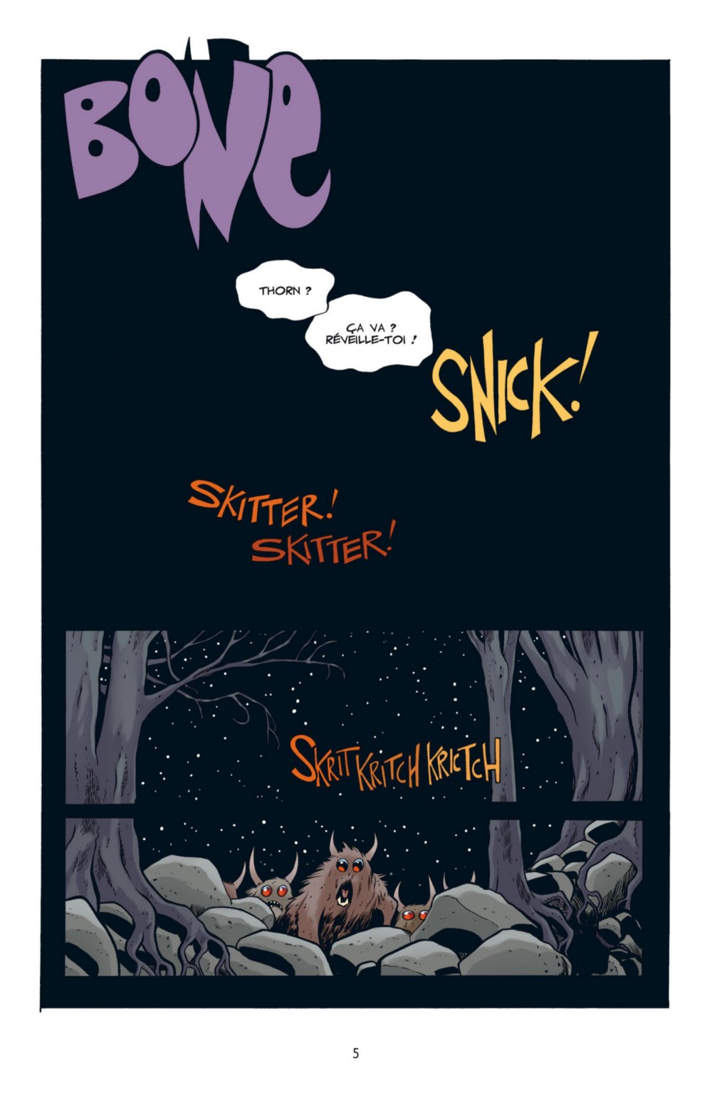 Que dire du dessin de cette série, en plus de l’excellent parti-pris de départ de prendre un graphisme cartoon pour les Bone au milieu d’autres personnages et décors semi-réalistes ? Qu’il est plein de trouvailles et de bonnes idées. La grande force de Jeff Smith et d’avoir proposé un découpage osé. Avec des transitions parfois matérialisées seulement par une illustration. Il utilise l’absence de personnage au centre d’un décors pour renforcer la tension et l’intrigue. Il va même faire confiance avec le lecteur dans les ellipses narratives qui nous permettent d’imaginer et de nous projeter dans l’univers sans rien perdre de sa cohérence.