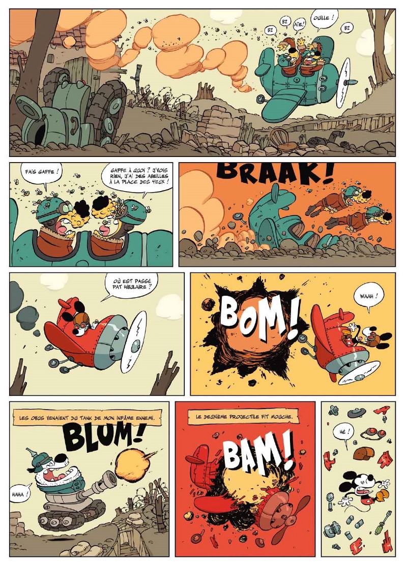Les pages fourmillent de clins d’œil, d’inventions et d’idées. Tébo synthétise le meilleur de ses univers autour de ces personnages archi vus et revus, et se permet le luxe d’en détourner les codes avec brio. Les doubles pages sont magiques et son trait rond et les couleurs presque flashy sont en parfait accord avec cette révision loufoque et idéale des aventures de Mickey.