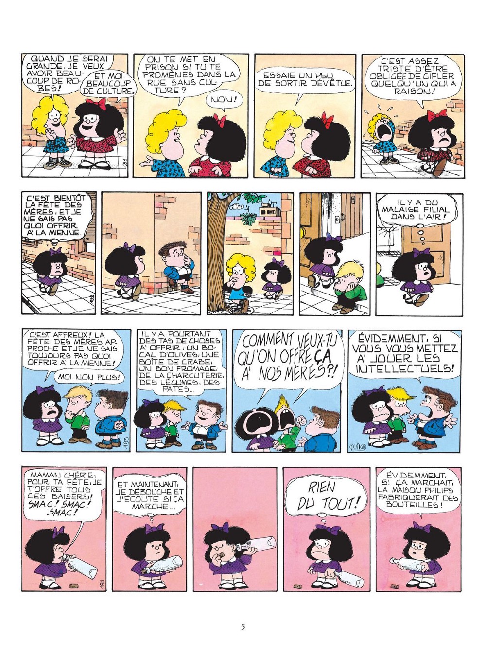 L’héroïne argentine accompagnée de ses camarades Manolito, Susanita, Felipe, Miguelito, et son frère Guille mène la vie dure à leurs parents et leurs voisins. Du haut de ses quelques années, elle surprend par le regard qu’elle porte sur la société et sur le monde. En désaccord avec tout son entourage, elle refuse d’accepter son sort, elle qui vit dans une famille de la classe moyenne argentine et reste incomprise de ses proches. Publiés entre 1964 et 1973 ces strips prennent souvent une tournure politique autour des grandes questions d’actualité et encourage l’esprit critique chez ses lecteurs.