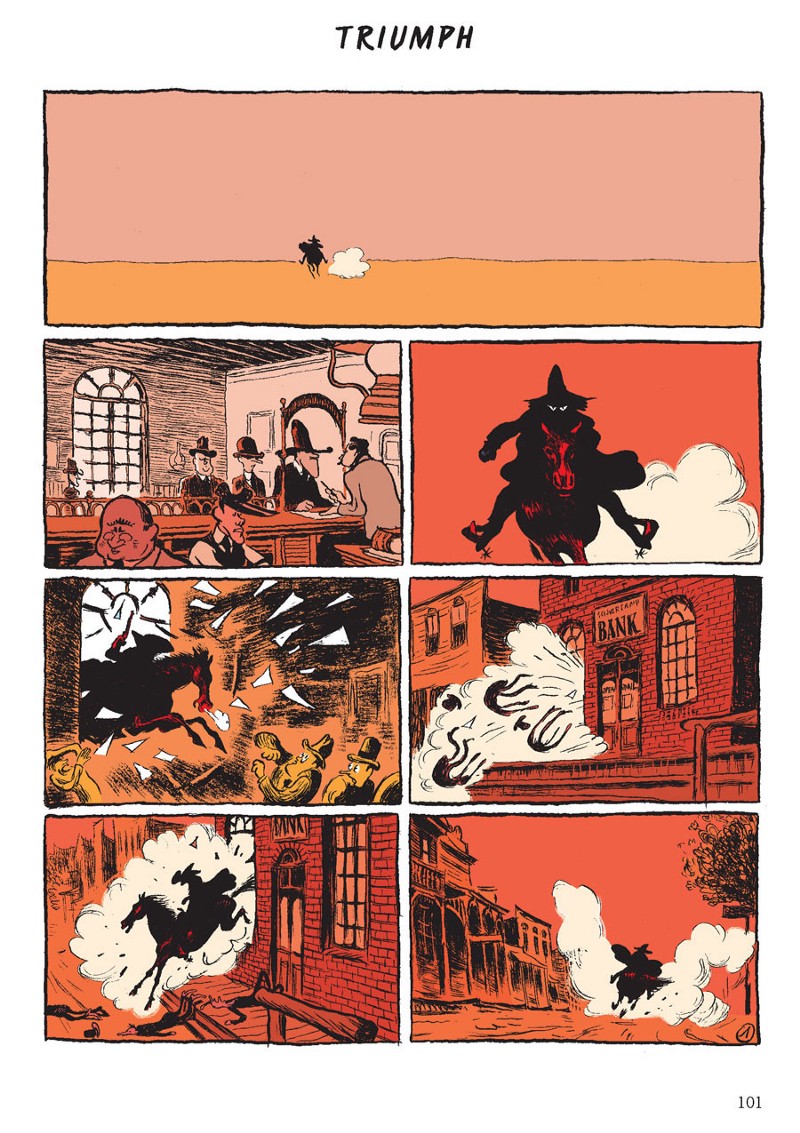 Chaque épisode recèle des trésors d’inventivité graphique et surtout de références au cinéma classique du western spaghetti à la grande épopée hollywoodienne. Christophe Blain est un virtuose du mouvement, son trait anime les personnages comme aucun autre auteur contemporain. Le trait noir et charbonneux du dessinateur oscille entre l’extrême précision et l’esquisse, épousant l’action et nous invitant à accélérer ou ralentir. Les décors et les personnages sont réduits à des silhouettes, les lieux sont symbolisés par des aplats monochromes ou deviennent des compositions incroyables de perspectives et de couleurs.