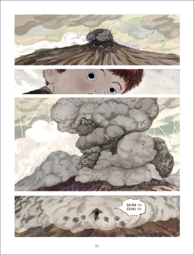 Comme dans Max Winson cette histoire tourne autour de l’obsession du prodige, de l’enfant doué dévoré par le monde qui lui reproche sa grâce. Un récit d’initiation aux frontières du mythe sans jamais passer au fantastique, un soupçon de réalisme magique. Ses histoires explorent la figure de cet autre, cet individu devenu étranger à ses semblables contre son gré, mis au ban pour ses aptitudes qui auraient pu faire de lui un héros. Et Grimr fait peur, un géant timide à la force (et la détermination) presque inhumaine. Son visage presque déformé sous sa tignasse rousse incarne la puissance du volcan qui gronde, son étroite connexion avec son environnement. Personnages et paysages sont étroitement liés dans cette histoire. Plusieurs pages laissent place au chant des montagnes qui se réveillent et expulsent le feu ou la glace.