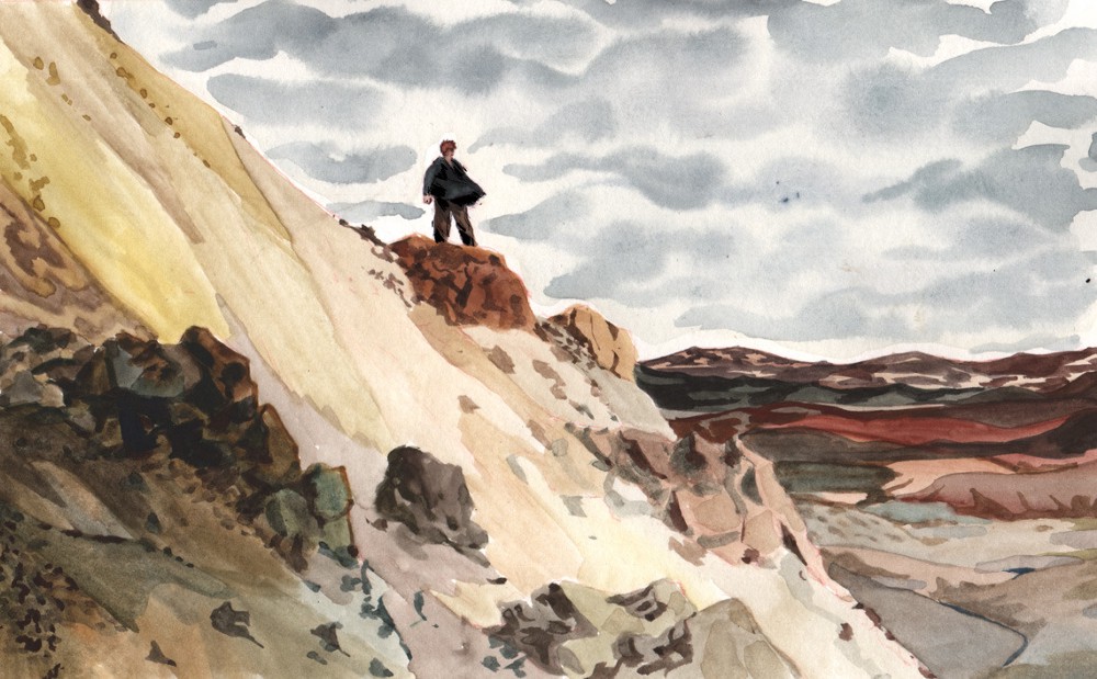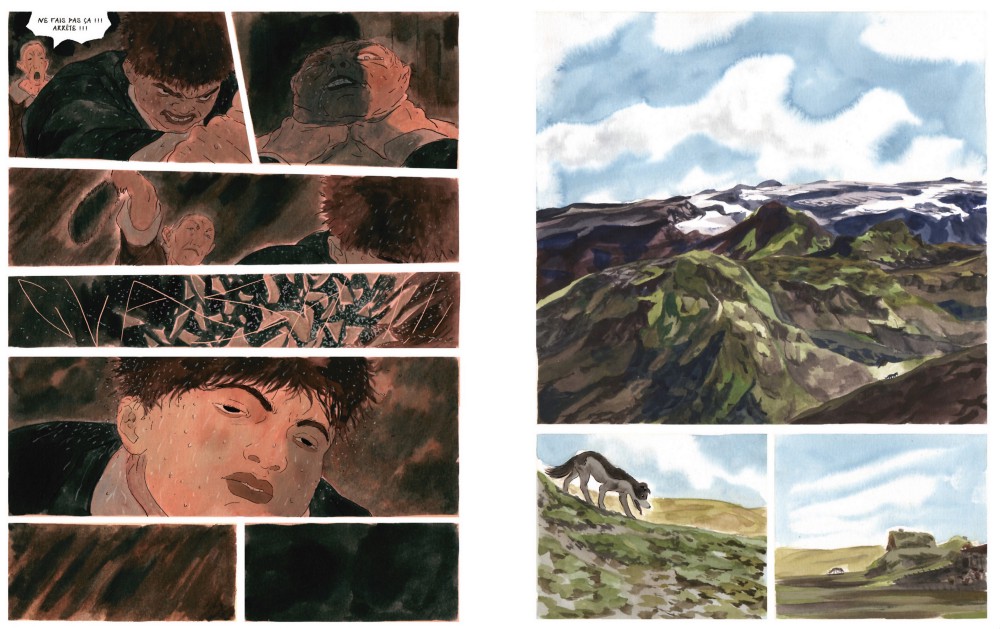 À chaque nouvel album, ce jeune dessinateur semble changer de technique tant au niveau du trait que de la couleur. Et cette fois, le livre est entièrement réalisé à l’aquarelle rehaussée d’un trait cerné pour les personnages. Assez virtuose, l’auteur se permet de grandes pages colorées pour nous faire percevoir la phosphorescence de la lave, la lumière des glaciers, les échos des aurores boréales. Un contraste d’autant plus saisissant que les protagonistes de cette histoire sont dessinés presque exclusivement en gros plans, focalisant notre regard sur les émotions de ses hommes perdus dans l’immensité de l’île.