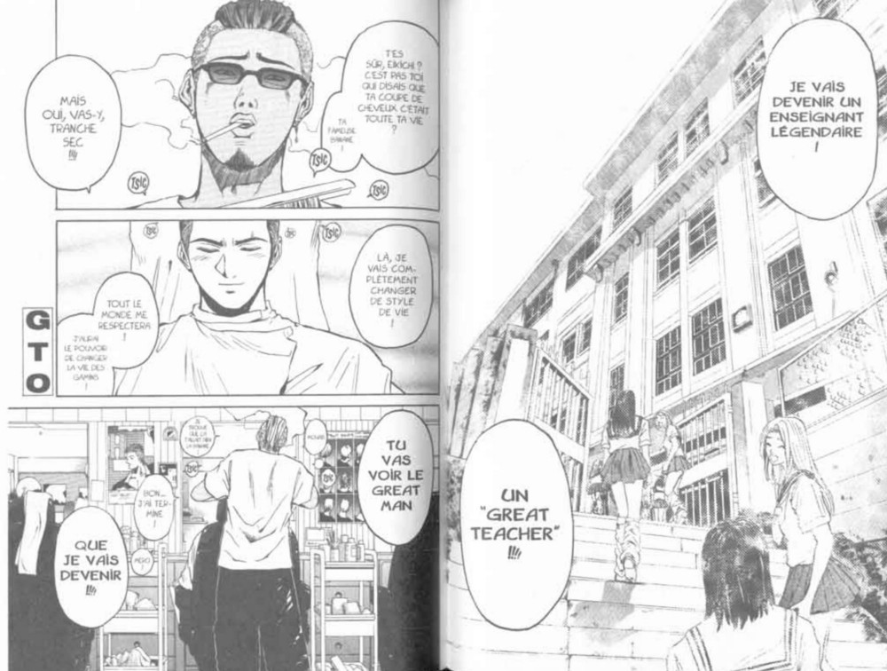 De gangster looser à héros éducateur. Un point de départ décalé qui permettra au jeune professeur Onizuka de montrer ce qu’il a dans le ventre, et qu’il n’est pas le salaud qu’il voudrait être. Au contraire, plus les situations deviennent tordues et perverses plus notre prof devient un héros. En particulier, comparé aux autres membres du corps enseignant qui ne sont pas recommandables sous leurs vernis respectables.