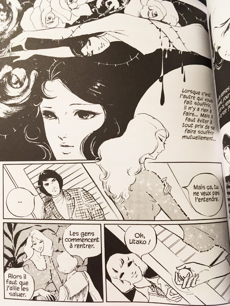 Je parlais de la force d’attraction du dessin qui m’a poussé à ouvrir ces albums tant les planches sont virtuoses. L’expertise de la dessinatrice, qui a déjà une carrière très riche derrière elle au moment de la publication de ces nouvelles, est à son apogée. Chaque case mériterait que l’on s’arrête pour sa composition, sa maîtrise des aplats de noirs dans un médium qui ne comprend que très peu la couleur, ou encore la finesse de ses personnages. Le découpage très onirique, proche de Kamimura crée des contrastes saisissants entre la dureté de certains chapitres et la beauté évoquée par cette mise en scène. Il manquerait presque un cahier graphique supplémentaire à la fin pour nous contenter. Ce serait du luxe, car je précise que l’édition est parfaite, le papier fait ressortir les noirs intenses de l’œuvre et la traduction est enchanteresse.