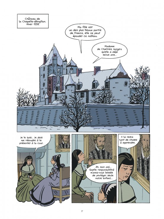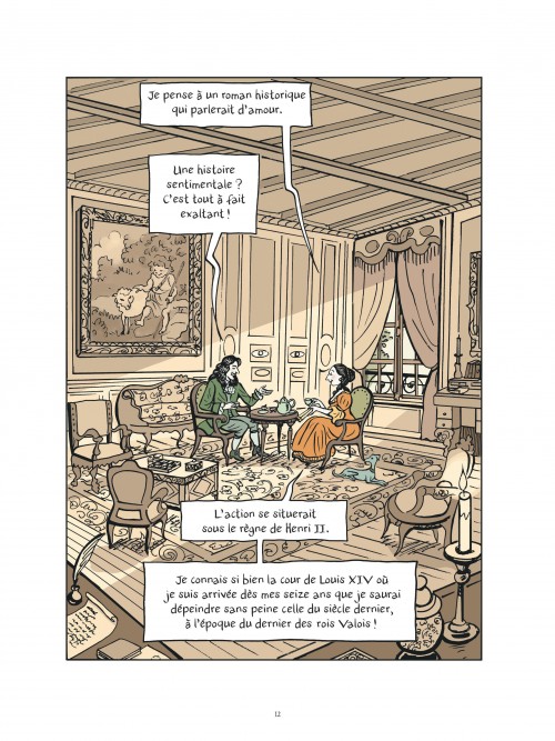 Travail à quatre mains pour transposer ce livre dans une version graphique qui colle au texte avec les libertés nécessaires à l’adaptation. Le duo s’était déjà attaqué à une figure historique déjà avec leur album Rose Valland, Capitaine Beaux-Arts ou Adieu Kharkov ; et là, recrée l’atmosphère de ce « petit roman » paru anonymement en 1678 aux intrigues amoureuses multiples, entre dévotion, amour courtois revisité et libertinage. Le roman raconte avec beaucoup de précisions la cour et les figures attachées à Henri II et les Valois et son écriture des personnages inaugurent une veine romanesque très moderne.