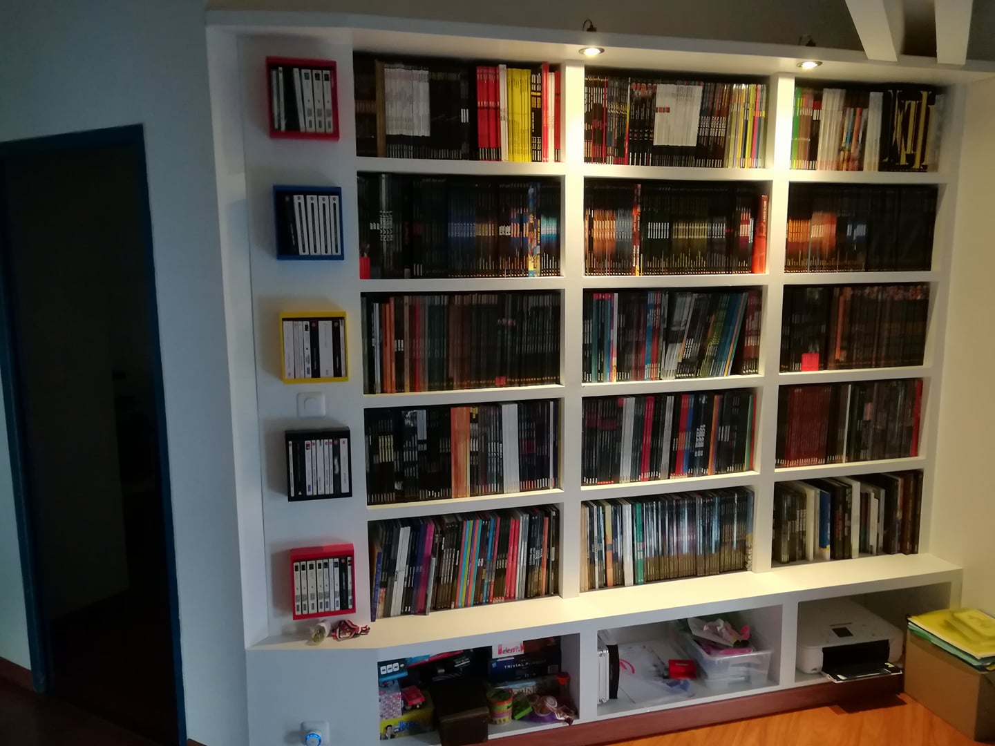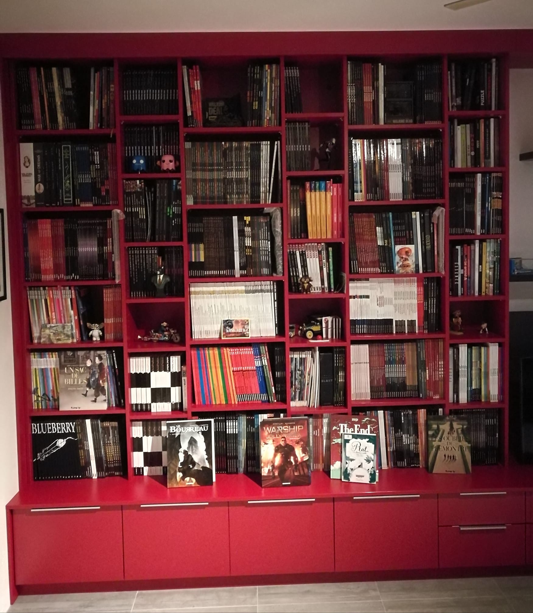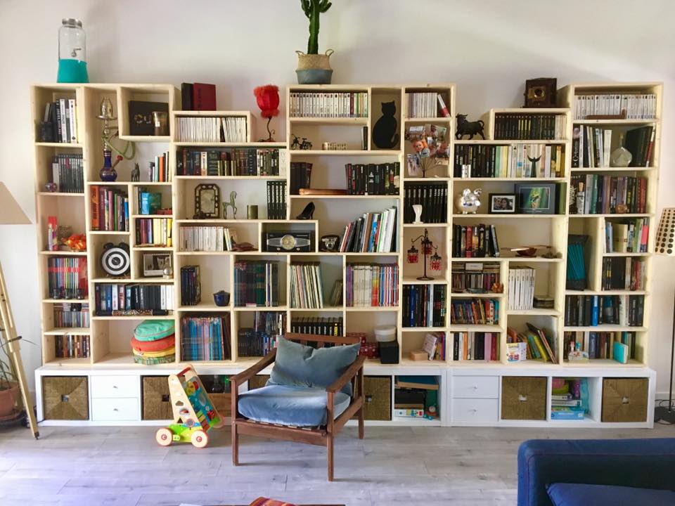 Là tout est possible. Après avoir eu plusieurs générations de Billy, de Kalax et d’autres, j’ai finalement opté pour le sur mesure, à la fois pour gagner de l’espace et avoir plus de rangements. J’ai attaqué avec des caissons modulables en hauteur ou dans des couloirs pour profiter de ses “espaces perdus”. Puis, j’ai construit une bibliothèque sur mesure dans la pièce du salon en achetant des planches à la découpe et en les fixant au mur.