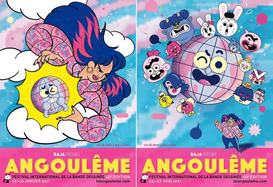 L’affiche de cette 48e édition a été dévoilée, signée par Chloé Wary et Willy Ohm, un diptyque qui fonctionne ensemble et qui sera utilisé en affiches distinctes pour les 2 temps du FIBD en janvier et juin. Un esprit plus pop qui rappelle celle de Blutch & Cizo en 2010, dont les influences lorgnent ici du côté du manga. On y voit une Terre autour de laquelle gravite des personnages non identifiés, soutenus pas une jeune femme énergique, un symbole assez fort alors qu’habituellement les auteurs représentent traditionnellement Angoulême, les grands héros ou leurs propres personnages.