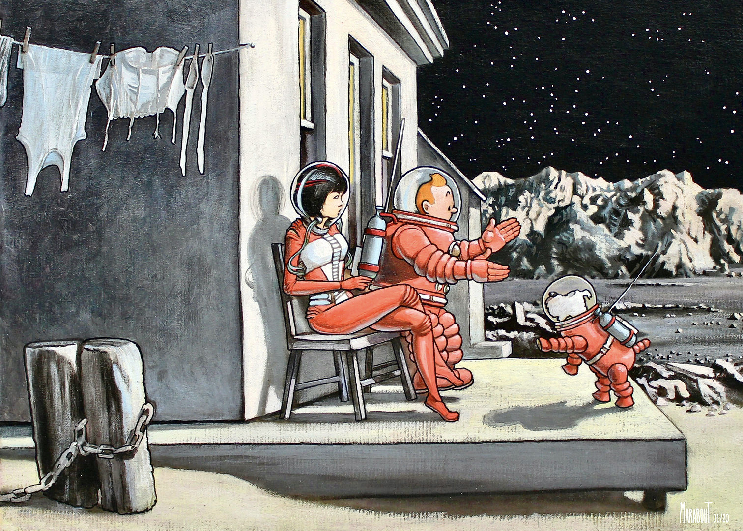 À la barre Xavier Marabout, un artiste qui pratique le mash-up. Le créateur associe dans ses œuvres des univers différents, reproduit des techniques de peintres ou des personnages de bandes dessinées pour composer des œuvres inédites à mi-chemin entre l’hommage et la parodie. Il multiplie les univers et croisements : Tex Avery x Picasso, Super Héros x art nouveau, Disney x Enki Bilal… et sa série la plus célèbre Tintin x Edward Hopper.