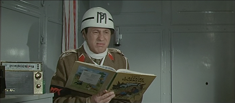 Un militaire lit L’affaire Tournesol dans Le cerveau de Gérard Oury (1969).