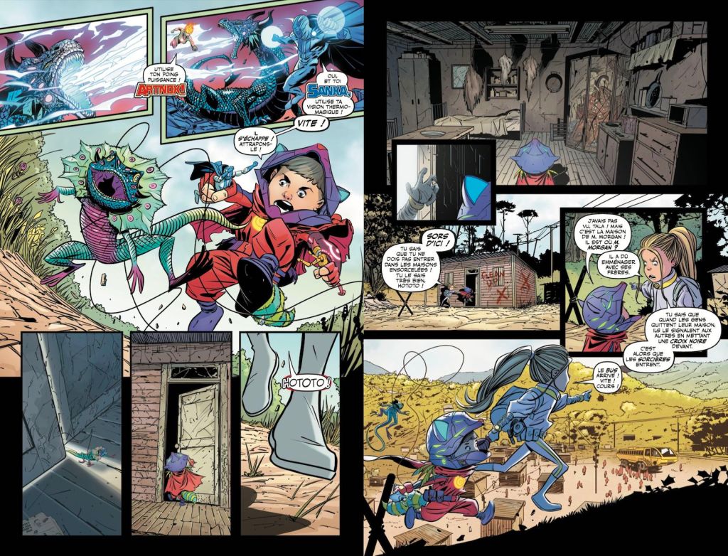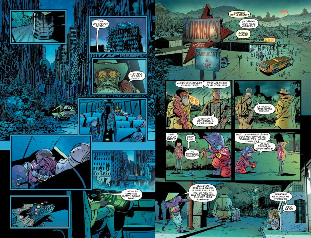 Le trait d’Inaki Miranda joue entre plusieurs registres, assez vif et stylisé, il lui permet de passer de scènes très dures à des passages plus cartoons, sans oublier les paysages qui se rapprochent d’illustrations de contes jeunesse. Un trait assez léché, rehaussé par les couleurs de Eva De La Cruz qui rendent à merveille cet univers à la fois beau et dangereux de couleurs très pop, flashy, détonnantes. On est surpris à chaque page, dans des planches qui s’amusent à mêler forêt luxuriante et jungle urbaine, robots géants et animaux mutants.