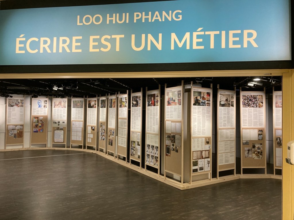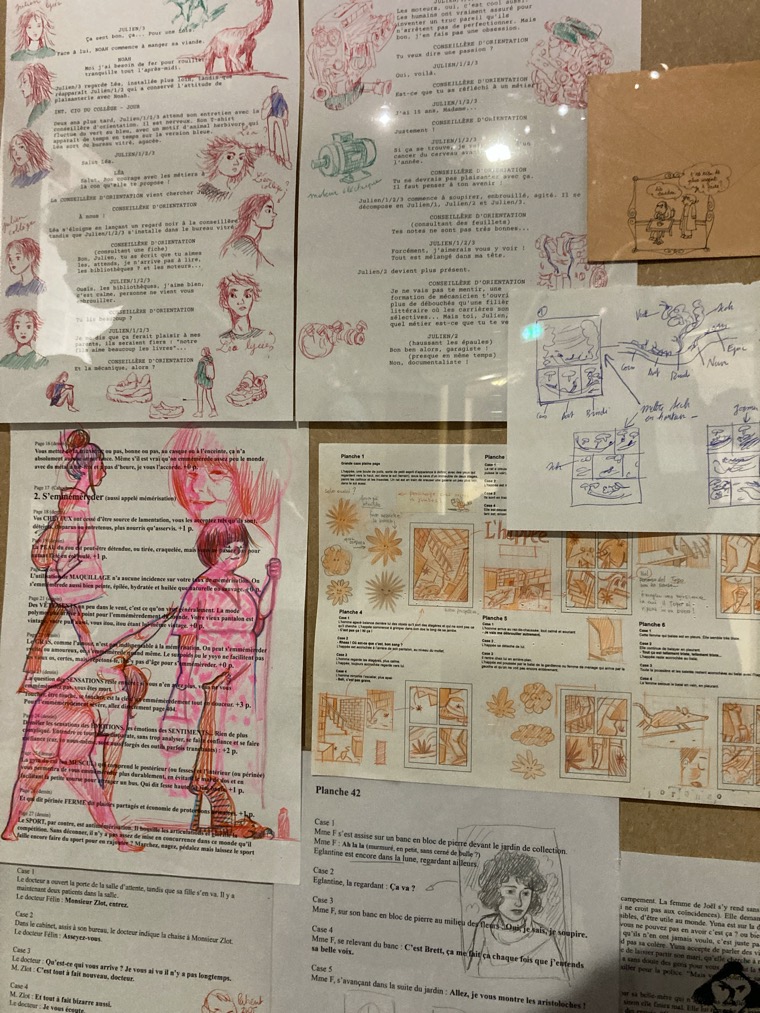 Loo Hui Phang : « Je fais cette expo dans le cadre du Prix René Goscinny du Meilleur Scénario [note : Loo Hui Phang l’a reçu en 2021 pour Black-out, dessiné par Hugues Micol], comme c’est un prix de scénario je me suis dit c’est l’occasion de faire une exposition sur le métier de scénariste. C’est vrai qu’on connaît bien les dessinateurs, on arrive bien à voir comment ils travaillent, par contre le scénariste reste mystérieux, dans la tête du public ce n’est pas un vrai travail, c’est quelque chose que l’on peut faire en dilettante…