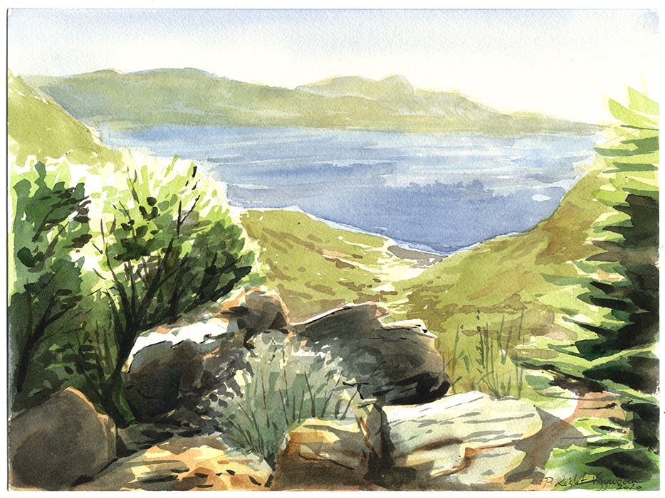 Le voyage en corse lui a permis d’apprivoiser les couleurs des décors avec sa palette. Les quelques aquarelles qu’il a réalisées sur place ont restitué d’une manière de plus en plus fidèle les tonalités des lieux. La pierre, la végétation, la mer, les ruelles ensoleillées ou envahies par la nuit… Patrice a travaillé ses mélanges et dressé une liste pour pouvoir ensuite insuffler tout ça à ses planches. La recherche du « vert-de-gris » des pierres qui composent les murs du village ne fut pas simple, mais en quittant Ogliastro, Patrice l’avait captée. Il ne fallait donc pas trainer au retour de Corse pour se lancer dans la réalisation des planches finales. Il se lance en débutant par la planche 60 qui est alors la planche la plus éloignée du début dont le crayonné ait été définitivement validé par nos discussions à trois.