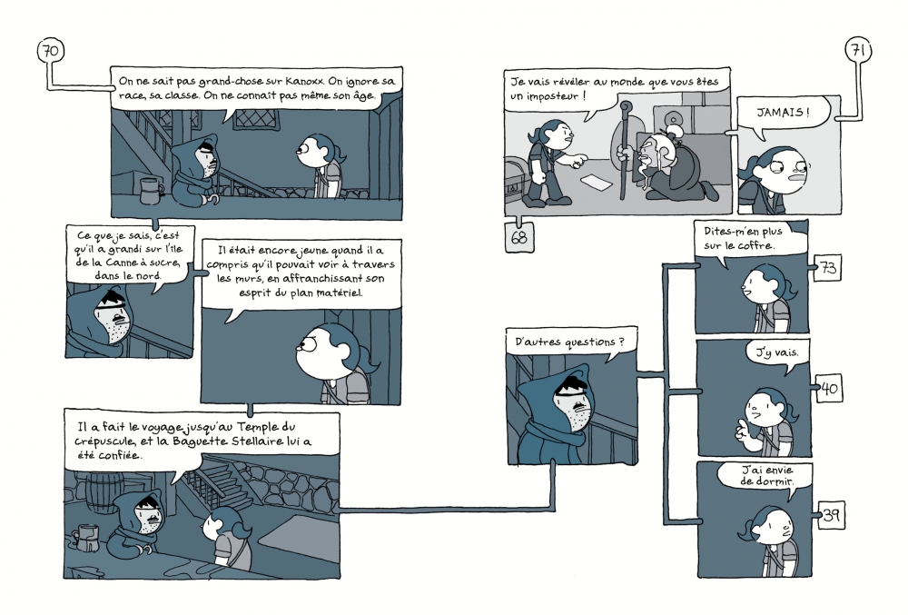 On incarne un personnage en quête de vérité, qui va aller à la source de la magie pour découvrir les secrets du sorcier Kanoxx et du monstre qui terrorise ses îles, le Léviathan. On y croisera des personnages étranges, des Clins d’œil au Seigneur des anneaux, à Game of thrones. Au fur et à mesure de la quête, on se balade de jour ou de nuit, on doit nager ou dormir, respecter les horaires pour les ponts ou la bibliothèque… Le dessinateur complexifie son livre-jeu, sans le rendre pour autant trop difficile, et réussit à nous proposer un « livre dont vous êtes l’héroïne/le héros » où on ne tourne pas en rond (chose assez rare dans ce type de livre). Une lecture fun et une expérience unique.
