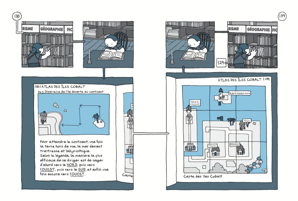 Car au labyrinthe du « livre dont vous êtes l’héroïne/le héros » va s’ajouter une dimension d’enquêteur, où l’exploration de la bibliothèque des Îles Cobalt va vous aider à avancer dans votre quête. Mieux, à la différence de certains livre-jeu sur ce modèle, Léviathan propose des énigmes pour pouvoir progresser, pas question de tester au hasard, il faudra un peu de réflexion pour s’en sortir. Autre idée très amusante de Jason Shiga, il nous pousse à tricher sur certaines pages, en glissant une porte de sortie, mais attention les personnages ne sont pas dupes !