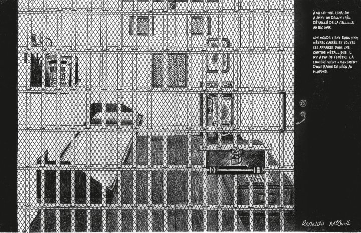 On apprend dans cet album toutes les règles qui conditionnent l’accès au monde des prisonniers. Renaldo est enfermé depuis presque 15 ans et a vécu toute sa vie d’adulte dans cette cellule qu’il occupe 23h sur 24h. Un univers limité, entre quatre murs, où toutes ces affaires doivent tenir dans une cantine en métal. Où son univers intime et artistique constitue l’une de ses seules fenêtres vers l’extérieur avec les correspondances qu’il entretient.