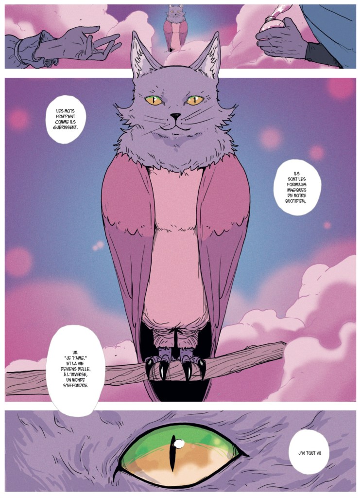 Jim Bishop emprunte aussi à ses influences, la temporalité propre au manga où il s’attache à développer les relations entre les personnages avec des séquences où le temps se dilate et d’autres plus elliptiques pour faire avancer l’histoire. Cette narration donne des albums à la forte pagination et une histoire qui prend son temps à s’installer afin de mieux nous immerger dans son univers charmant qui bascule vers le malaise. Un glissement réussi qui oppose la magie à la désillusion : celles citées plus haut, mais aussi celles de ces associations que l’on fait entre magie et amour dans le langage courant.