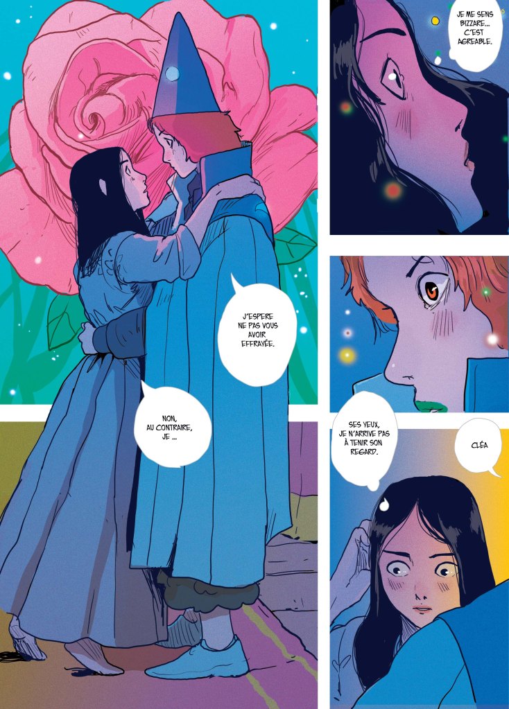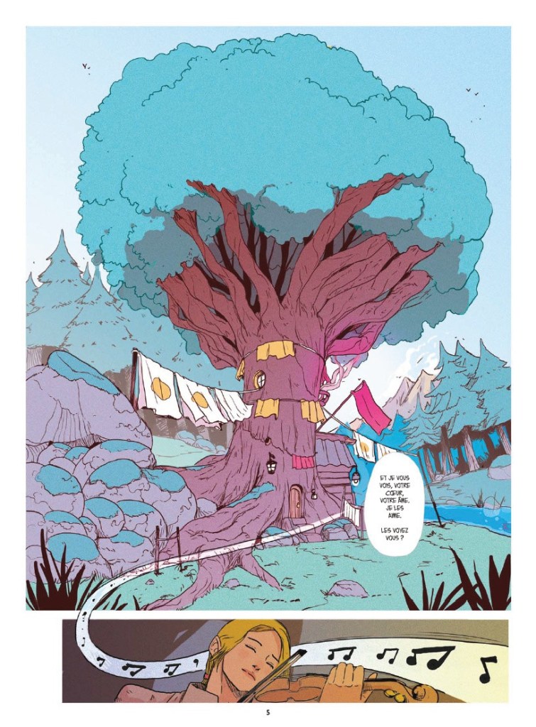 Son trait épuré fait la part belle aux émotions à travers des visages discrètement expressifs et des cadrages qui captent les regards. L’auteur propose un découpage où certains objets ou personnages s’affranchissent des cases ou de la composition pour créer un effet féérique, mais aussi pour appuyer le fond et ce désir de liberté des personnages. Seul petit défaut de cette approche, certaines planches présentent des persos moins fouillés, mais cela semble plus tenir au scénario qui est très resserré sur les protagonistes. Pour appuyer cette esthétique, les décors deviennent des effets de matières et l’ensemble bénéficie d’une palette de couleurs bigarrée et fluo qui renforce l’atmosphère du conte et cette séduction immédiate.