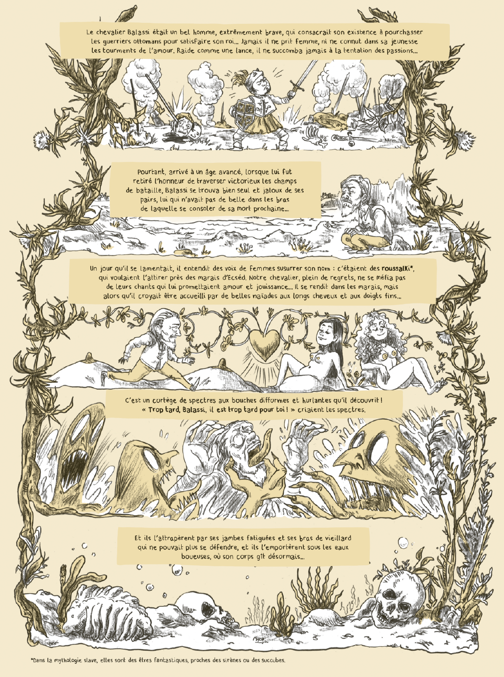 Ce que je voulais faire, dans mon dessin, c’était marquer une différence entre le récit et les récits dans le récit. Par exemple, dès qu’il y a une lettre ou une légende qui est racontée : le dessin change et prend des ornements ou même un type de personnages un peu différent.