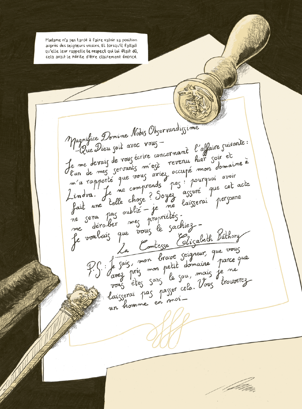 Avec cet album Anne-Perrine Couët interroge ce mythe, ce personnage et tout ce qui l’entoure en proposant un album composite, où les récits s’imbriquent dans les récits, pour mieux comprendre cette figure historique. À l’aide d’une solide documentation et de conversations avec Gábor Várkonyi, un historien hongrois spécialiste du sujet, l’autrice s’est lancée dans une biographie atypique qui surprend par ses choix graphiques audacieux.