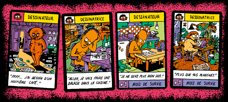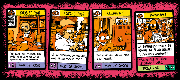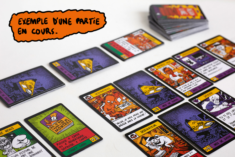 Composé de 90 cartes, ce jeu est conçu pour des parties de 30 minutes pour 2 à 4 joueurs et permet surtout, derrière le jeu et l’humour, d’avoir un aperçu du quotidien d’un.e dessinateur.ices. Comprendre les galères financières et administratives, les difficultés pour faire éditer son projet mais aussi pour le défendre une fois sorti. Pour découvrir l’univers des maisons d’édition, des festivals, des dédicaces, des prix….
