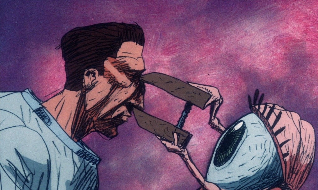 Si vous ne faites pas encore partie des inconditionnels comme moi, je vous invite à découvrir ces films réalisés de manière artisanale et en toute indépendance. Travaillant avec une équipe très réduite, Bill Plympton dessine quasiment l’entièreté des dessins nécessaires à la réalisation de ses films (environ 40 000 dessins pour un long-métrage comme Les Amants électriques (Cheatin’)) en plus du scénario & de la réalisation. Certains de manière traditionnelle sur celluloïds peints comme L’Impitoyable lune de miel ! (I Married a Strange Person!) & Les Mutants de l’espace (Mutant Aliens), d’autres aux crayons de couleur…