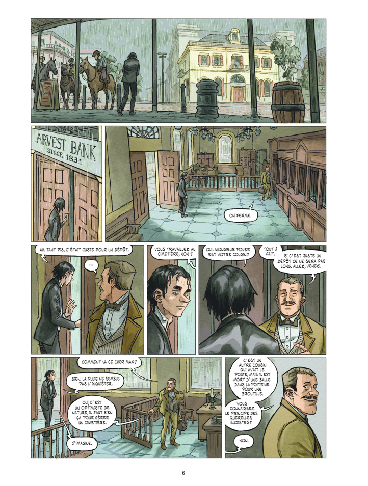 Silhouette noire, coiffure ailes de corbeau, regard froid, le fossoyeur municipal se démarque sur chaque planche de cette série. Elijah Stern détonne avec son intégrité qui lui joue des tours et son côté nonchalant qui en énerve plus d’un au pays des armes à feu. Mais plus dangereux qu’un pistolero, Stern est un héros qui lit.