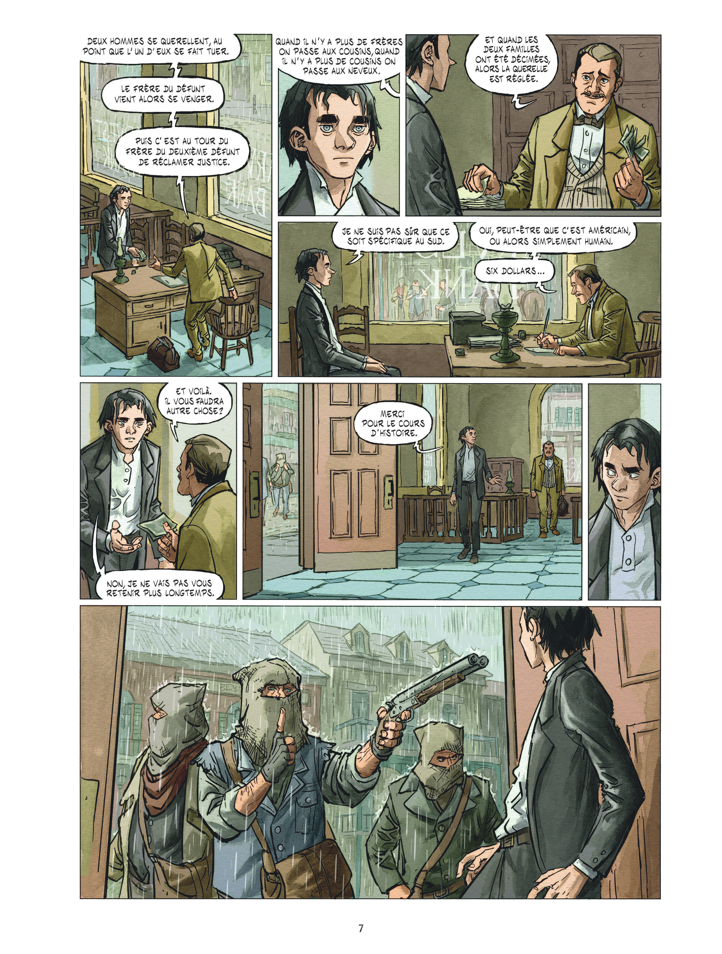 Une particularité de taille dans cette série qui entend bien jouer avec les codes et les clichés du genre, et d’autres, en jouant avec les références des lecteur.trice.s. Et pour cela les auteurs jouent sur plusieurs niveaux de lecture. Tout en déroulant le fil rouge de la vie de Stern, on découvre au fil des volumes, un regard sur les genres avec un premier tome façon enquête, un deuxième choral, un troisième sur le western, un quatrième sur le gothique et ce cinquième sur le thème de l’évasion/prison. Avec également un jeu sur le rythme des saisons, un focus à chaque volume sur les archétypes du western et un jeu sur les lieux qui passent crescendo de la petite ville à la ville moyenne puis la grouillante Nouvelle-Orléans.