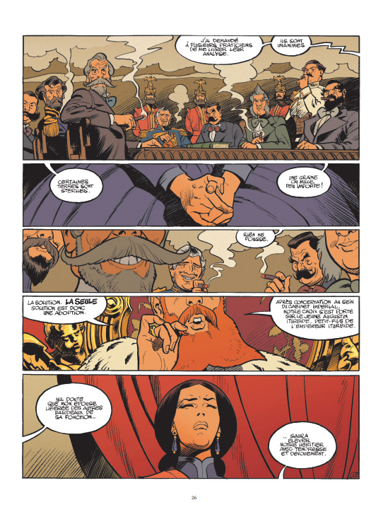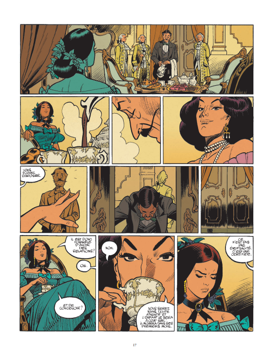 Avant-dernier acte de cette pièce dessinée : Matthieu Bonhomme & Fabien Nury ont donné tout un décorum théâtral à leur série, depuis la pièce à laquelle assistent les personnages dans le premier volume à la maquette des temples mésoaméricains que fait faire Charlotte pour la présenter à Paris. Ces personnages puissants ne sont que des marionnettes dans les mains de personnes qui le sont encore plus, les auteurs tirent partie de cette idées pour le cadre même de leur histoire. Charlotte et Ferdinand-Maximilien vont en faire les frais malgré leurs prétentions royales et intellectuelles. Avec cette bonne idée d’avoir pris le parti de raconter cette période historique du point de vue de la jeune femme avec tout ce que cela implique et d’en avoir fait un personnage fort à travers ses faiblesses et sa détermination.