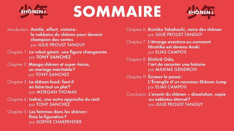 Deux livres de 270 pages plus des livrets bonus obtenus grâce à la campagne, deux mooks de luxe qui s’interrogent sur les Shōnen & Shōjo au sens large, de leurs définitions à leur réception en France, en passant par leurs évolutions ou œuvres clefs ; voici ce que proposent les Moutons électriques qui a réuni huit auteurices : Julie Proust Tanguy, Tony Sanchez, Sophie Charpentier, Morgan Thomas, Elias Campos, Justin Kwedi, Samuel Minne et Maxime Gendron.