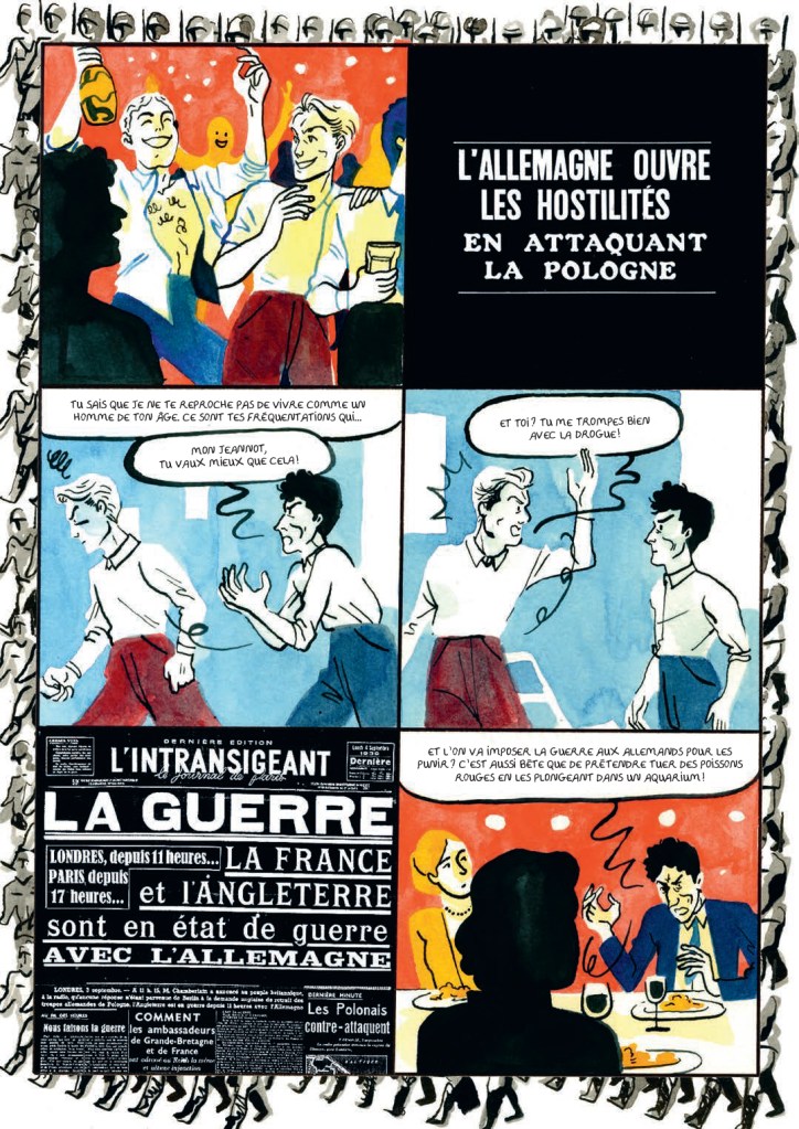 Si Cocteau ne s’intéresse pas à la guerre, mais que les éléments contextuels nous le rappellent, c’est qu’il s’intéresse plus à l’amour et à Jean Marais. Dans Les choses sérieuses, les autrices mettent en scène leur relation amoureuse, intellectuelle, charnelle… Mais au-delà de la passion ou de la routine qui s’installe, ce seront les rumeurs, les ragots, les manchettes de la presse ; ce seront les disputes autour de la drogue, de la différence d’âge, de la politique…