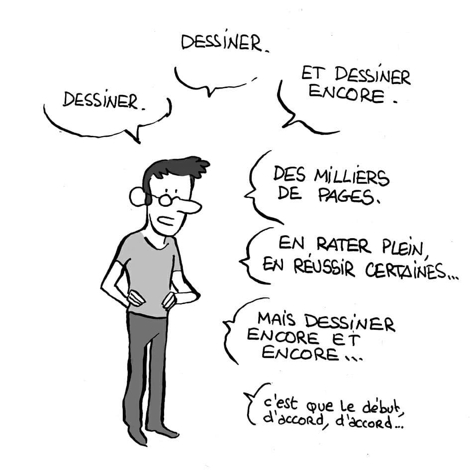 Il m’arrive très fréquemment de finir aussi ma journée par ça. En dessinant un peu plus rapidement. C’est plus, 10 minutes pour sortir de tout ce que j’ai fait dans la journée. La bande dessinée c’est quand même quelque chose d’assez contraignant : on est dans des cases, on doit respecter des règles, une narration, un récit… Il y a quelque chose qui retient parfois le dessin. Et l’idée de finir ma journée en le relâchant, en lui redonnant une forme de liberté avant de passer à autre chose. J’ai du mal à me passer de ces deux moments-là.