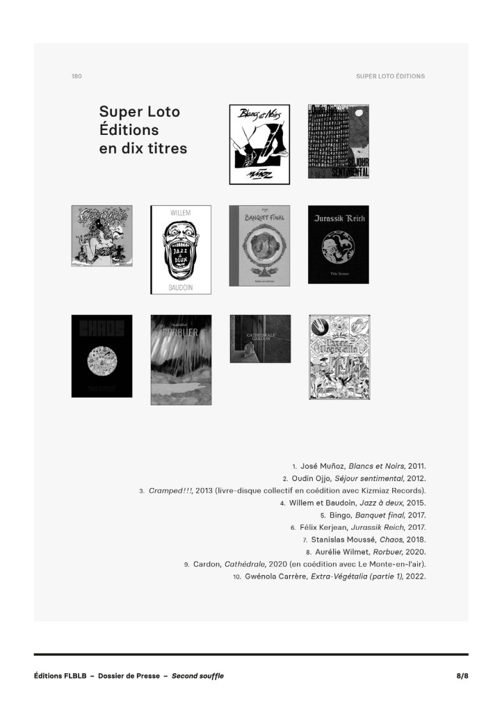 Sous titré bandes dessinées alternatives 2000-2020, ce livre présente un panorama de l’édition alternative “deuxième génération” qui a pris la suite des structures indépendantes comme L’Association, Cornélius, 6 pieds sous terre, Les Requins Marteaux… et qui ont à leur manière elles-aussi changées le paysage éditorial dans les décennies où les gros éditeurs ont eu aussi investi le champs de la bande dessinée alternative via des collections dédiées. Dans Second Souffle l’auteur interroge les éditeur.trice.s de 11 maisons d’édition pour en faire un bilan à date, en évoquer les albums clefs, les chiffres et les spécificités.