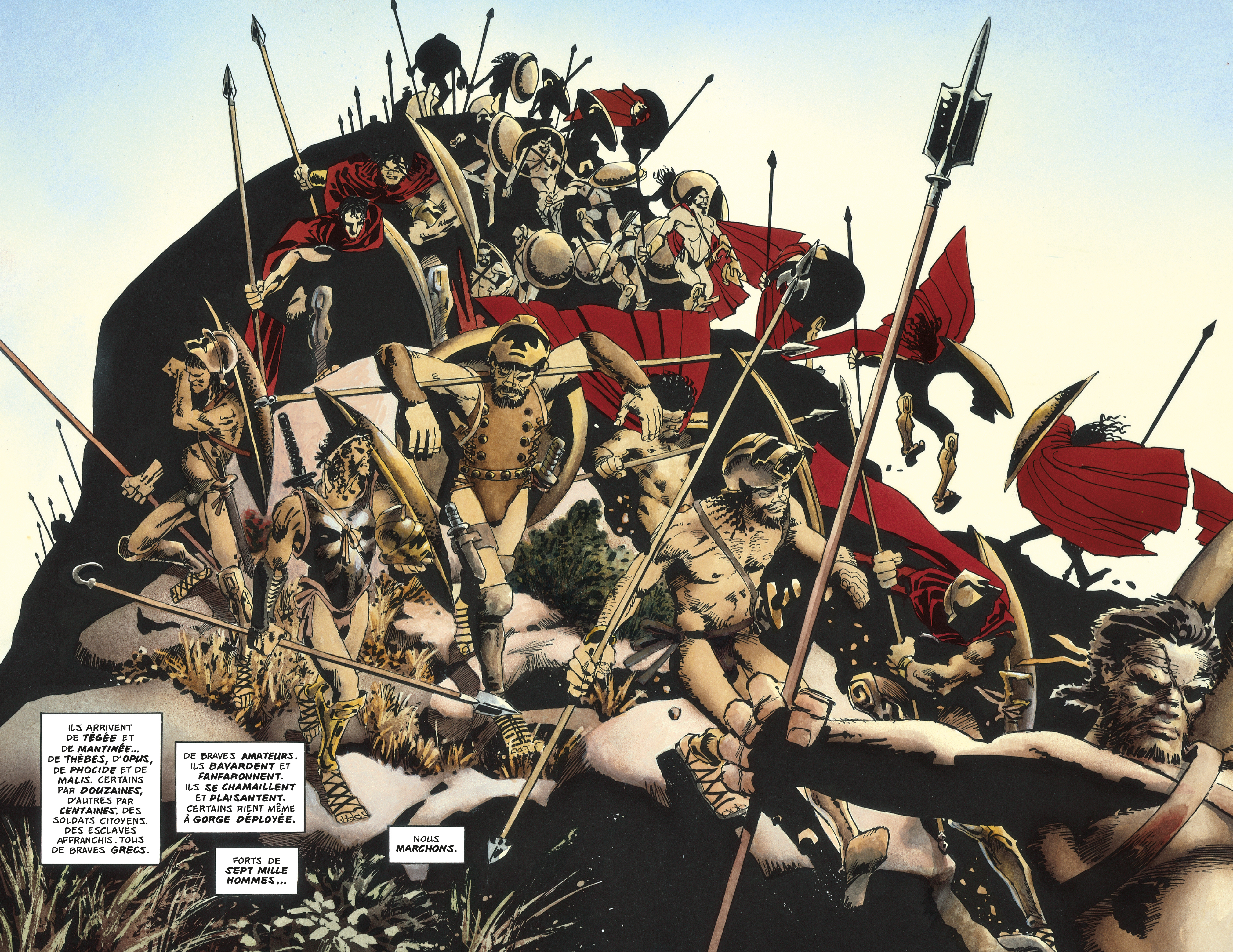 300 raconte la version très personnelle de Frank Miller autour d’une bataille qui a fait date dans l’histoire grecque, où une troupe de soldats de la cité-État de Sparte auraient affronté la plus grande armée de l’époque. La bataille des Thermopyles racontée par Hérodote où quelques hommes défendent un col pour ralentir l’armée devient le récit d’un homme, Léonidas. Le chef de guerre et ses 300 hommes se dévoilent en creux de cette bataille, face au roi Xerxès qui s’accapare cette partie du monde. L’histoire devient sous les dessins de Miller & couleurs de Varley une mythologie moderne, testostéronée proche des personnages sombres & torturés qu’affectionne l’auteur de Sin City.