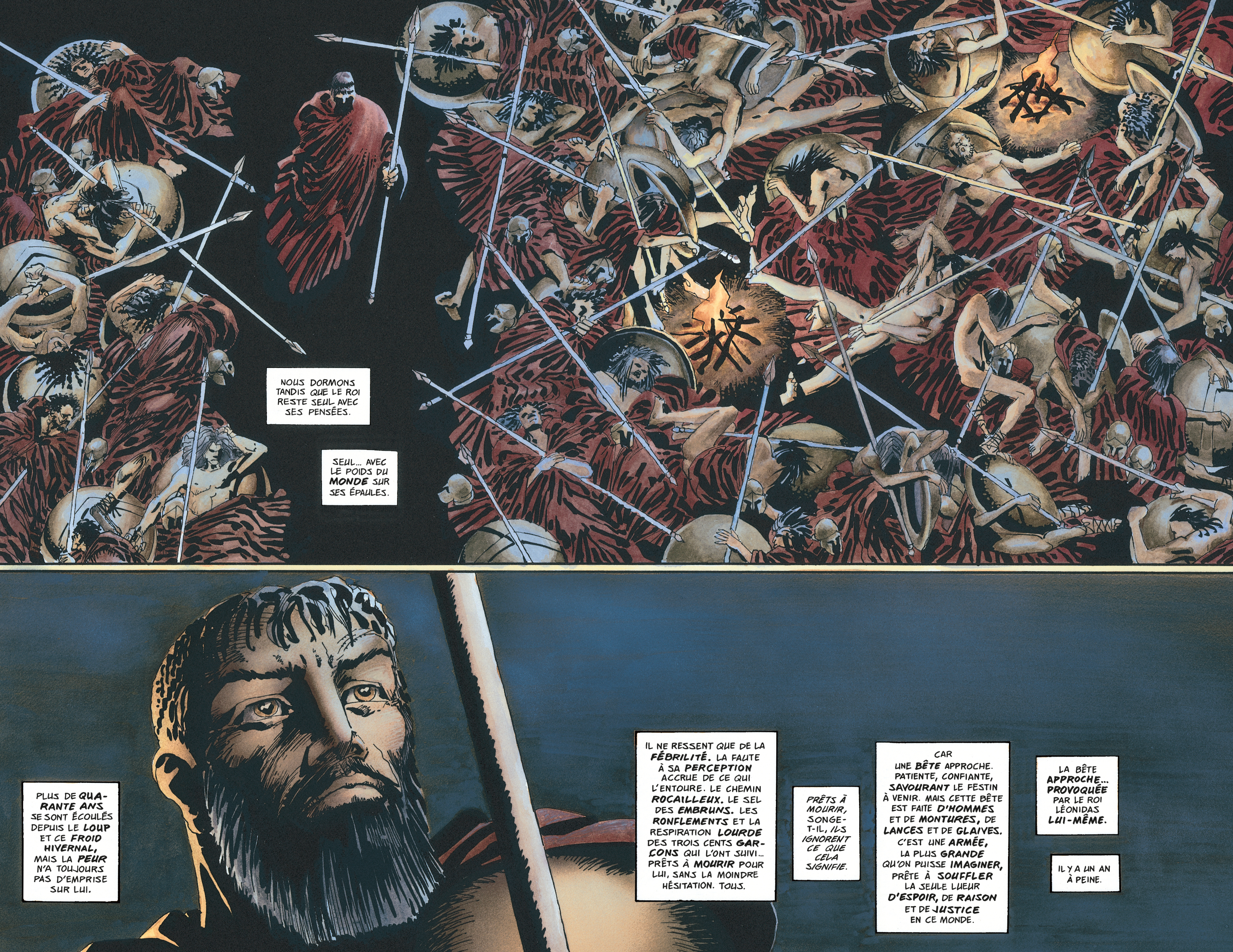 Seul bémol à ces bonnes nouvelles, la disparition du nom de la co-autrice du livre, Lynn Varley, sur la couverture des livres. Car 300 est assez à part dans la bibliographie de Frank Miller dans son usage des couleurs où le couple qui travaille ensemble — en plus d’avoir travaillé sur une bonne partie des titres de Frank Miller depuis The Dark Knight Strikes Again, Lynn Varley et lui ont été mariés de 1986 à 2005— se met à expérimenter graphiquement. Si les couleurs numériques de Lynn Varley ont marqué les esprits dans Batman, elle devient littéralement co-autrice des planches de Miller dans 300 en proposant un style unique ajoutant profondeur, carnation et flash au trait plus libre de Miller sur ce projet.