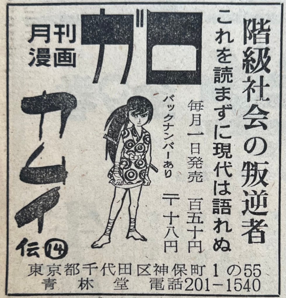 On avait décidé d’insérer un cahier de 16 pages, ça se remplit très vite ! Je préférais mettre des documents un peu inédits par exemple une carte postale qui remonte à 1965 —dont il ne doit pas avoir beaucoup d’exemplaires en circulation— éditée par Seirindō pour essayer de gagner des lecteurs au moment où les ventes n’étaient pas top. J’ai retrouvé aussi, dans les archives de Nagai, un journal aujourd’hui totalement disparu : le journal des étudiants en médecine avec en première page une publicité pour Garo. C’est ça que j’ai voulu montrer : des choses que l’on ne trouve nulle part.