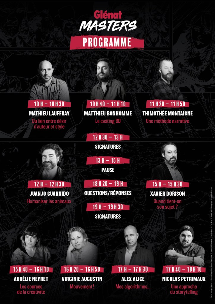 Le samedi 2 mars, de 10h à 12h puis de 15h à 18h vous pourrez assister à ces Glénat Masters et notez également que de 12h à 12h30 puis de 18h30 à 19h vous pourrez également tenter d’obtenir une dédicace ou une signature auprès des auteurices.