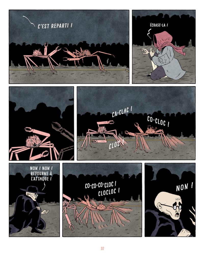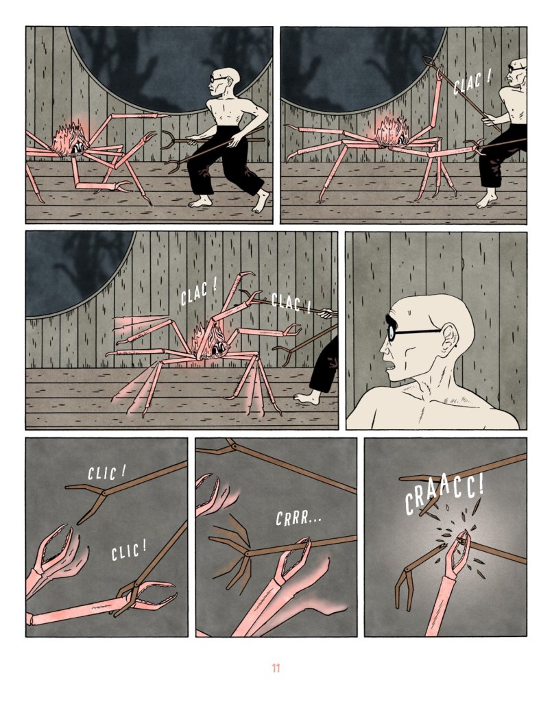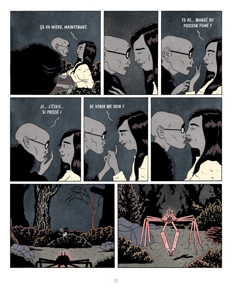 « Pour la partie graphique, j’ai plusieurs références, qui vont des films, aux mangas gekiga en passant par des tirages anciens. J’adore le cadrage et la mise en scène développés par Yasujirō Ozu dans ses films qui placent la caméra assez bas ; et j’ai utilisé ce principe pour pas mal de scènes. Du Gekiga, j’ai apprécié le rythme des histoires et les atmosphères étranges créées avec des ombres et du silence — Yoshiharu Tsuge, par exemple, dont les planches sont souvent sombres et violentes.»