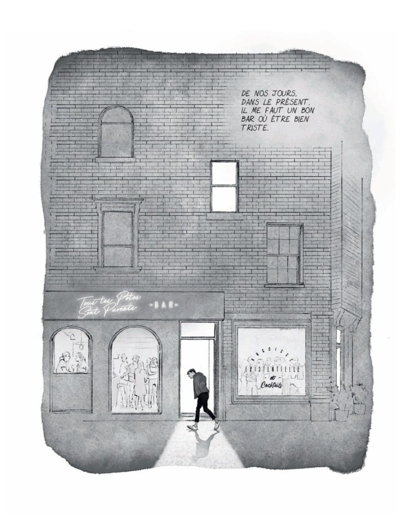 Si Nick vit sa vie comme une pièce de théâtre, Will McPhail crée un décor à la mesure du personnage où, avec beaucoup d’humour, il invente des bars qui s’appellent « tous tes potes sont parents » ou des cafés branchouilles « franchement on en veut juste à ta thune » — on souligne au passage les efforts d’adaptation très fun et fins du traducteur Basile Béguerie qui trouve quelques pépites.