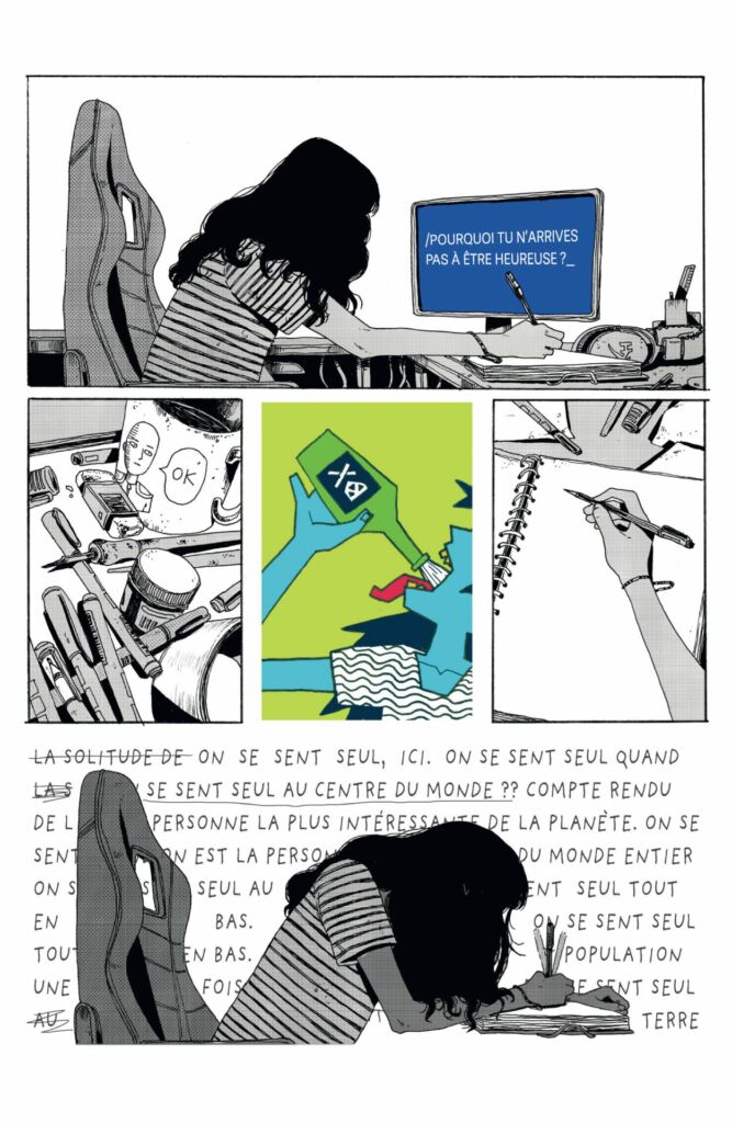 La chanson d’Orelsan aurait pu être la bande son de cet album qui décrit la difficulté de connecter avec les autres autrement que par l’art et la place que celui-ci prend. Mais si le chanteur attaque par la partie positive, la dessinatrice fait le point à un moment de sa vie où tout s’emballe et où sa dépression chronique la pousse à des pensées suicidaires.