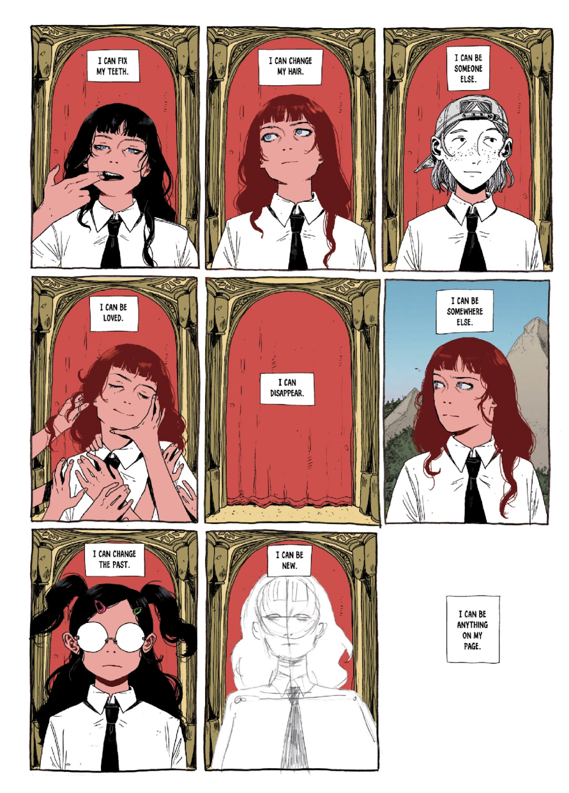 Comme chez Emily Dickinson, Zoe Thorogood va personnifier sous forme d’allégories et de personnages certaines émotions ou pensées. Ainsi la dépression prend les traits d’une créature tortueuse nommée Happy et va accompagner les différentes versions de Zoe tout au long du livre. De la Zoe cartoon incarnant l’optimisme de la jeunesse, à la Zoe manga pré-ado ou encore la Zoe “Stupid drawings” pour la version jeune adulte, ces avatars lui permettent de mettre des mots et des images sur ces sensations et questionner ce mal être.