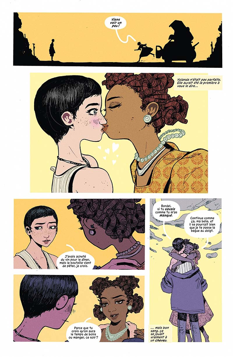 Avec cette réflexion en toile de fond, on découvre surtout un couple : Honeysuckle & Yolanda brisé par cette pluie d’aiguilles et pris dans cette petite ville où tout a chacun peut révéler une part sombre face à la catastrophe qui vient. Joe Hill et David M. Booher creusent les thématiques de la confiance et la manière dont on communique avec les autres dans des situations de crise. Ils permettent à la dessinatrice de jouer avec ces réflexions qu’elle travaille en parallèle dans ses propres livres, même si les crises ne sont pas du même registre. Ici, Honeysuckle va entamer une quête qui la dépasse dans un monde où l’horreur peut se cacher derrière les choses les plus banales. Investie d’une mission, croisant au fil de son chemin ce que l’humanité cache de pire ou de meilleur, Honeysuckle va devenir une héroïne malgré elle.