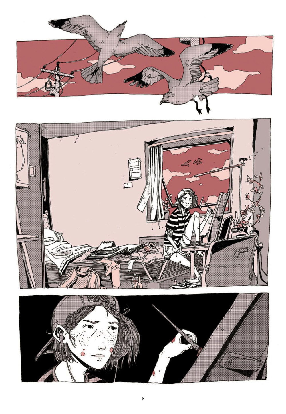 Et It’s Lonely at the Centre of the Earth va appliquer cette idée avec cet album très généreux dans ses idées graphiques, son découpage et son exploration artistique. Les variations de styles sont très maitrisées, les apports de la couleur, son utilisation des trames ou les pleines pages au noir profond nous embarquent immédiatement. Depuis Dans les yeux de Billie Scott son trait est devenu moins hésitant et se fait plus technique même s’il garde une apparente simplicité. Elle se permet des passages plus stylisés après son expérience sur Rain, un comics qu’elle a réalisé avant It’s Lonely at the Centre of the Earth et dans lequel elle a assuré la partie graphique sur un scénario de David M. Booher d’après une nouvelle signée Joe Hill.