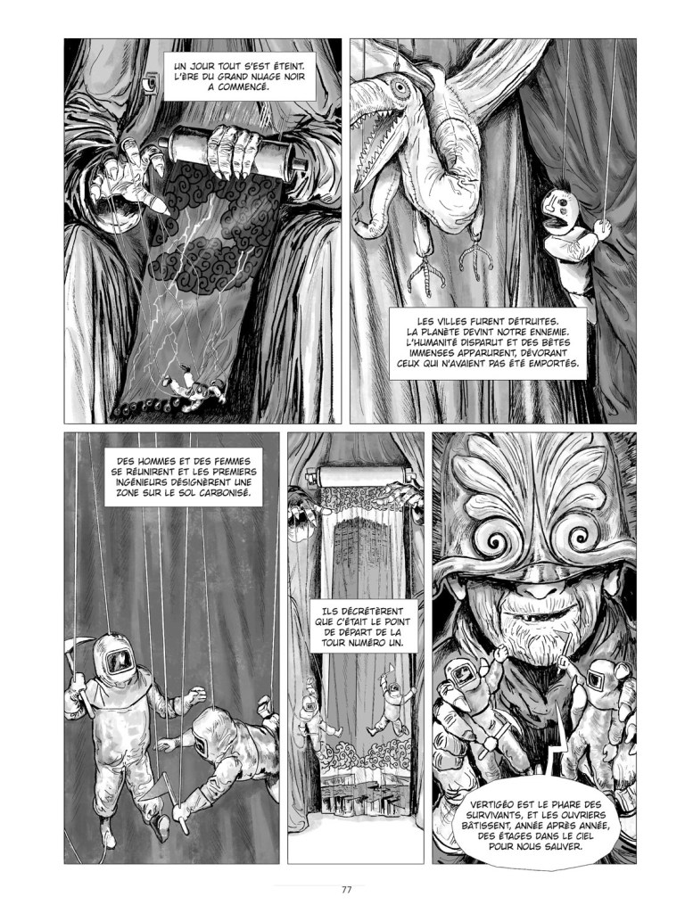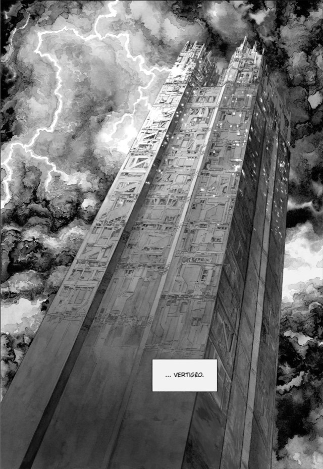 Vertigo s’ouvre sur un monde cauchemardesque où le futur de l’humanité se réduit à un lieu unique —ici une tour sans fin, dont les habitants sont condamnés à construire toujours plus haut— dont les conditions de fin du monde se dévoilent au fur et à mesure et questionnent notre époque en miroir, et s’organise autour d’un protagoniste torturé qui va en découvrir la finalité malgré lui. Un monde fait de castes organisées autour de la construction, de secrets en héritage, se dévoile petit à petit en suivant un chef de chantier qui va découvrir ce qu’il n’aurait pas dû.