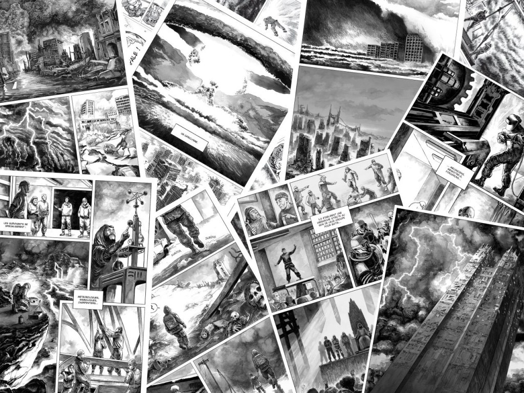 Dans cette approche, on peut y voir une influence de Blame de Tsutomu Niheï mais aussi K de Jirô taniguchi dans ses focus sur les chutes ou la manière dont les corps alourdis de combinaisons sont en mouvement à la verticale. L’encrage et les lavis jouent aussi sur cette perception, dans un album qui mêle plusieurs techniques. Avec ce cerné bien épais et les designs qui lorgnent plus du côté fantastique que de la SF, l’ensemble renforce encore cette impression de récit rétro mais pas suranné.