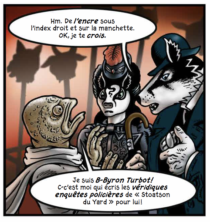 Et Byron Turbot dans tout ça ? L’alter ego de l’auteur en poisson étonnant se met en scène comme écrivain de « véridiques enquêtes policières de “Stoatson du Yard” », un peu comme Watson avec Holmes, Turbot avec LeBrock ou avec Hawksmoor pour boucler la boucle ?