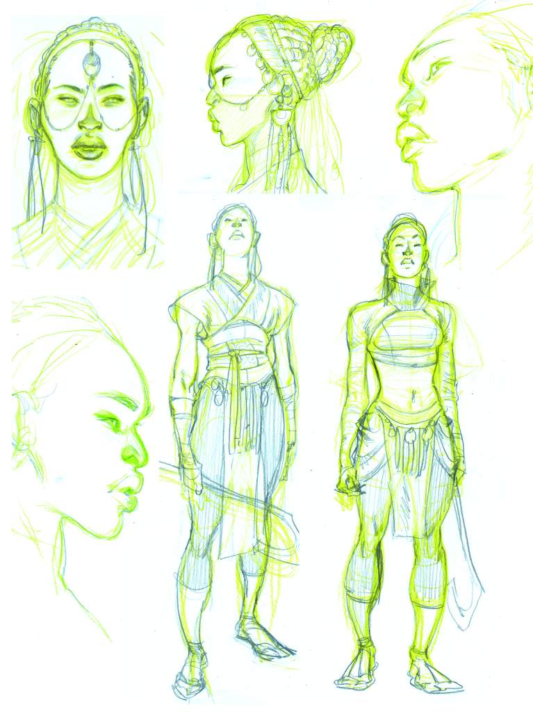 L’émotion est très forte quand on voit un personnage exister, ici en particulier le Dieu-Fauve qui est le personnage principal de cette histoire malgré le récit choral. Et il arrive qu’on l’interprète différemment selon comment il est dessiné. Dans le prochain album, il y aura des cyborgs et Roger m’a proposé un look pour un des cyborgs qui me plaît beaucoup alors que ce n’est pas du tout ce que j’avais imaginé. Je vais sans doute suivre son intuition graphique s’il arrive à la tenir dans la durée parce que, pour l’avoir vécu avec d’autres dessinateurices, un personnage peut apparaître d’une telle manière le temps de 2-3 dessins, mais finit par s’incarner différemment sur la durée. C’est assez compliqué à prévoir, mais on va toujours choisir les meilleurs croquis, mais c’est évident qu’un personnage va nous échapper de la même manière qu’un comédien ou une comédienne peut échapper à un réalisateur ou à une réalisatrice.