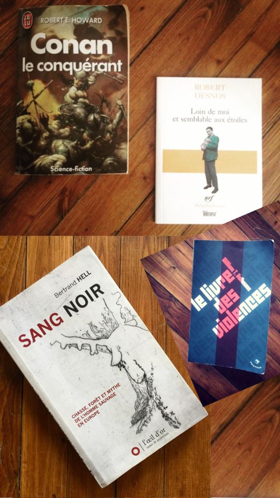 Je lis beaucoup de choses et j’aime bien le moment, où avant de commencer un récit, je sors quelques livres fétiches —et c’est un peu le sens des livres sur cette photo— en me disant : « Tiens, si j’essayais d’écrire un récit qui serait à la croisée de Conan le barbare, de Lovecraft, d’un recueil de poésie de Paul Eluard, d’un essai sur la violence et d’un essai sur la chasse ». J’aime bien avoir ce moodboard, ces « totems », même si un livre ne ressemble jamais à ce qu’on veut, parce qu’ils me rappellent ce que je voulais produire à l’origine.